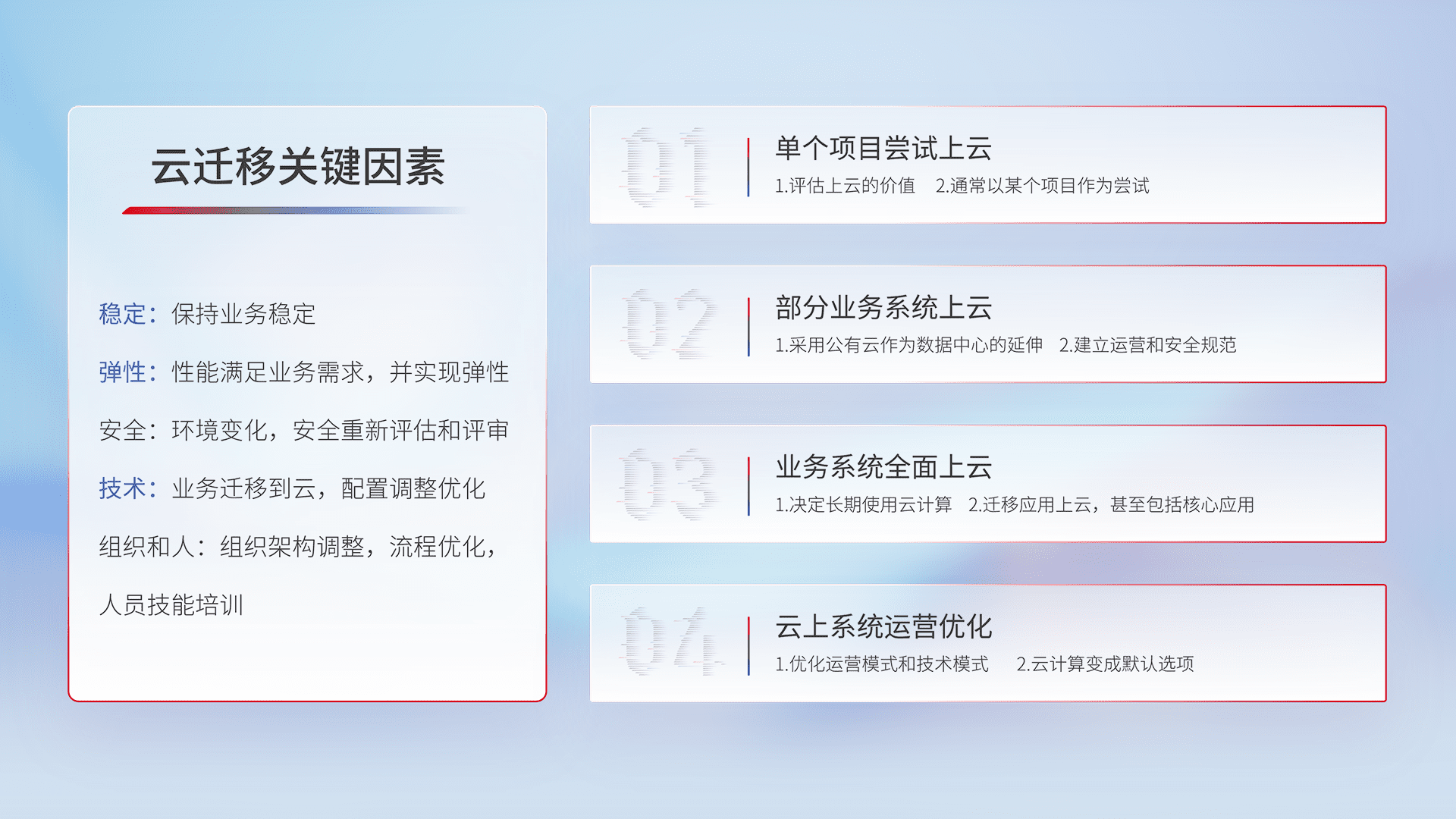 结合实际业务,,,从规划设计、、、、云平台选型、、云原生改造、、、数据迁移、、、集成交付,,,迁移全过程为客户识别最佳上云路径,,,做好风险识别管理,,,,设计网络架构、、、身份权限、、、、安全审计合规、、、、操作审计、、日志审计、、、、监控告警策略、、、、多站点容灾设计等,,对云上基础设施进行整体规划,,,提升IT治理水平,,,以满足弹性、、、、高可用、、、高性能的需求。。。。
